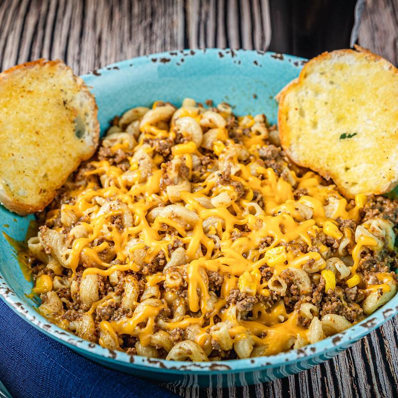 Ground beef, macaroni noodles and corn cooked in a flavorful beef broth and topped with shredded American cheese. Served with garlic bread.