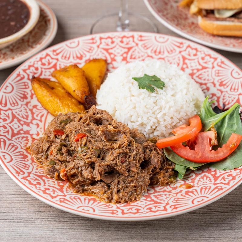 The national dish of Cuba! Braised shredded beef exquisitely seasoned with Cuban spices. Served with white rice, black beans and maduros (sweet plantains).